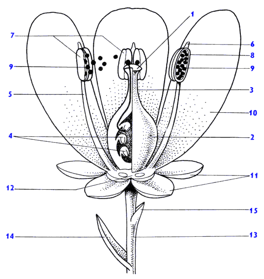 1 - рыльце , 2 - завязь , 3 - столбик , 4 - семязачаток , 5 - тычиночная нить , 6 - связник , 7 - пыльник , 8 - пыльник в разрезе, 9 - пыльцевые зерна , 10 - лепесток , 11 - чашелистик , 12 - цветоложе , 13 - цветоножка , 14 - прицветник , 15 - прицветничек .
